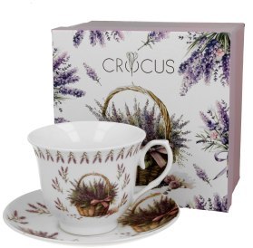 Filiżanka ze spodkiem Kosze Kwiatów LAWENDA wchodzący w skład serii CROCUS, wykonany z porcelany New Bone China, charakteryzującej się elegancką i naturalną kremowo - białą barwą z delikatnym połyskiem, a także wyjątkową wytrzymałością.