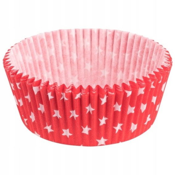 Papierowe foremki na muffinki z nadrukowanymi białymi gwiazdkami na czerwonym tle. Foremki te znacznie upiększą Twoje wypieki. Maksymalna temperatura pieczenia wynosi 220 C. W zestawie znajduje się 60 szt.