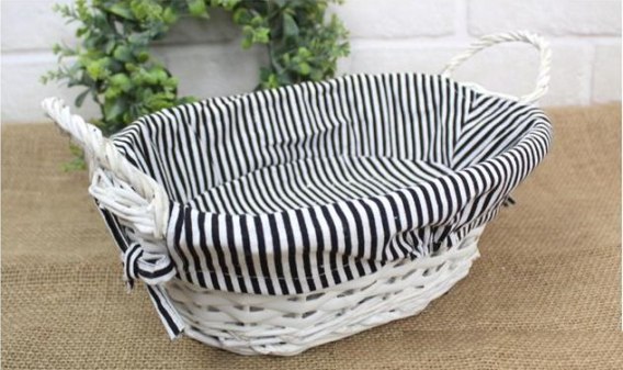 Koszyk wiklinowy biały wyściełany materiałem czarno białym w pasy 27x20x9 cm HX29209OV-1