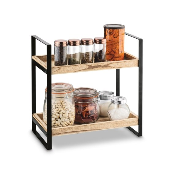 - Zyskasz mały regał na blat z dwoma drewnianymi półkami