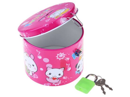 Metalowa puszka posiada otwór do wkładania pieniędzy do środka oraz jest zamykana na kłódkę z dołączonymi 2 kluczykami, aby w razie potrzeby oszczędności mogły zostać wyjęte i jeden z nich był w zapasie w przypadku zgubienia. Kolorowa puszka jest estetycznie wykonana z błyszczącego metalu z nadrukowaną grafiką wesołych zwierzątek.