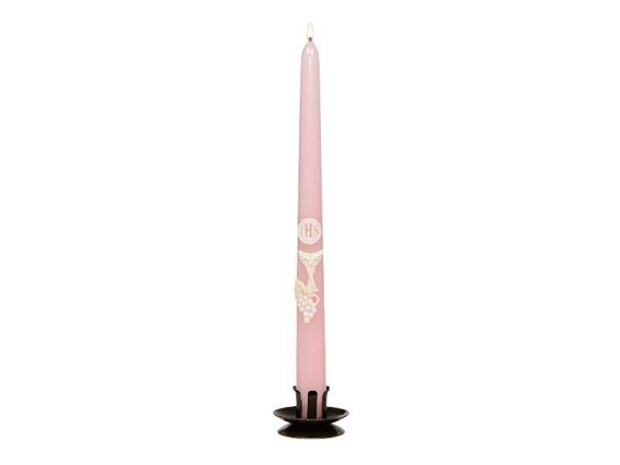 Świeca stożkowa Komunijna z hostią IHS, różowa, 29 cm - 4 szt.
