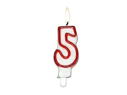 Świeczka cyfra''5''z czerwoną obwódką i brokatem 24szt 62-05