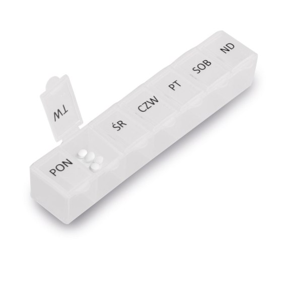Produkt pomoże ci uporządkować i lepiej zorganizować przyjmowane lekarstwa. Z jego pomocą dopilnujesz odpowiednich dawek. Możesz przygotować je od razu na 7 dni z góry (polskie oznaczenia na wieczkach).