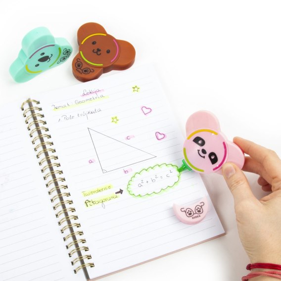 Zakreślacze 3w1 Kidea. W jednym zakreślaczu ze zwierzakiem - misiem, koalą lub leniwcem skrywają się aż trzy kolory neonowych końcówek: żółty, zielony i różowy. Z pewnością docenią je wielbiciele pomysłowych i minimalistycznych rozwiązań, którzy nie lubią nosić zbyt dużo w piórniku, a którzy wziąż chcą mieć najpotrzebniejsze przybory pod ręką. Kolorowe zakreślacze sprawdzą się podczas sporządzania notatek, zaznaczania ważnych zagadnień w trakcie nauki czy podkreślania tematów lekcji.