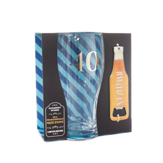Zestaw 2w1 szklanka do piwa ze złotą cyfrą "40" z otwieraczem do butelek "Na zdrowie " w ozdobnym opakowaniu prezentowym . 500 m