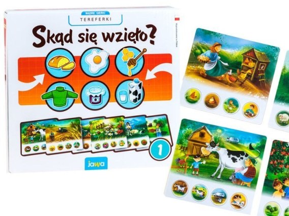 Logiczna układanka "Skąd się wzięło?" z serii Mądre Gierki Tereferki, przeznaczona jest dla dzieci powyżej 4 roku życia. Układanka zawiera scenki, a zadaniem dziecka jest ułożenie żetonów z obrazkami w odpowiedniej kolejności, tak aby powstała historia jak powstał dany produkt.
