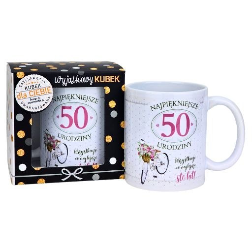Taki kubek 50-stkowy sprawdzi się nie tylko jako prezent od rodziny, lecz również jako upominek od przyjaciół, koleżanek czy znajomych. Dzięki uniwersalnemu wzorowi oraz trwałemu wykonaniu będzie cieszył obdarowaną osobę przez długie lata.