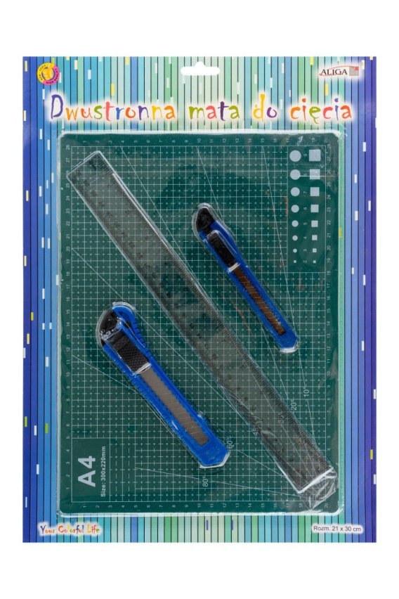 Mata dwustronna do cięcia w rozmiarze 21cm x 30cm, dwa nożyki, linijka 30cm.