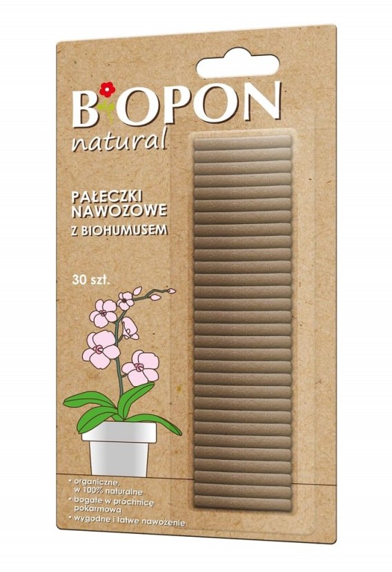 BIOPON pałeczki nawozowe z biohumusem to organiczny, w 100% naturalny nawóz przeznaczony do zasilania wszystkich roślin domowych i balkonowych. Wyprodukowany z odchodów dżdżownic kalifornijskich. Pałeczki są bogate w próchnicę pokarmową, dzięki czemu poprawiają właściwości i strukturę podłoża, zwiększają jego zdolność do zatrzymywania wody i ograniczają wymywanie składników pokarmowych. Pobudzają życie biologiczne gleby i zapewniają optymalne warunki do rozwoju systemu korzeniowego. Pałeczki stopniowo ulegają rozpuszczeniu, dzięki czemu odżywiają rośliny w sposób ciągły, przez długi czas. Ich regularne stosowanie zapewnia roślinom odpowiednie odżywienie, optymalny wzrost oraz zdrowy i piękny wygląd.