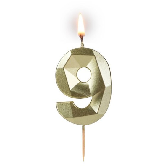 Świeczka cyferka "9" 5,8cm "DIAMENT" ZŁOTA na patyku ( długość patyka 4,2cm / 2cm ) 24szt. 64-09
