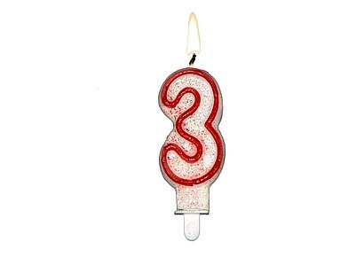 Świeczka cyfra''3''z czerwoną obwódką i brokatem 24szt 62-03