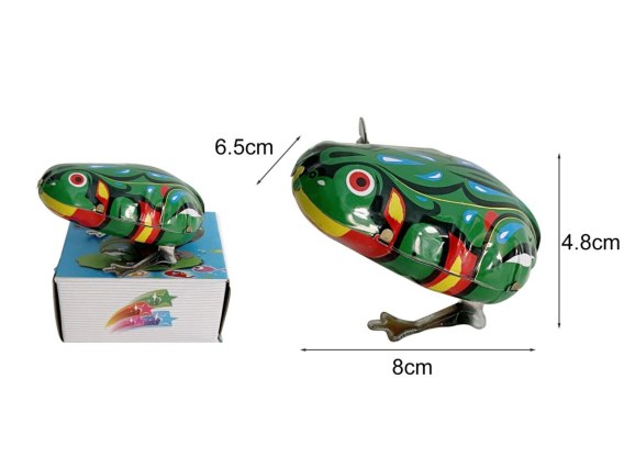 - Nakręcana na kluczyk - wystarczy kilka obrotów, aby żabka zaczęła skakać i poruszać się na sprężynce, zapewniając mnóstwo radości i zabawy.