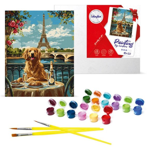 - Gotowe do malowania płótno z eleganckim motywem „Retriever w Paryżu", podzielone na pola oznaczone numerami