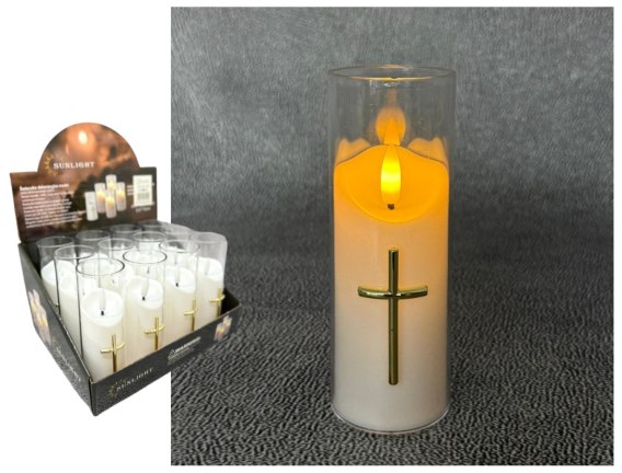 Znicz wkład led świeca plastik z migającym płomieniem złoty krzyż światło ciepłe 5,5 x 15 cm AE-A7094